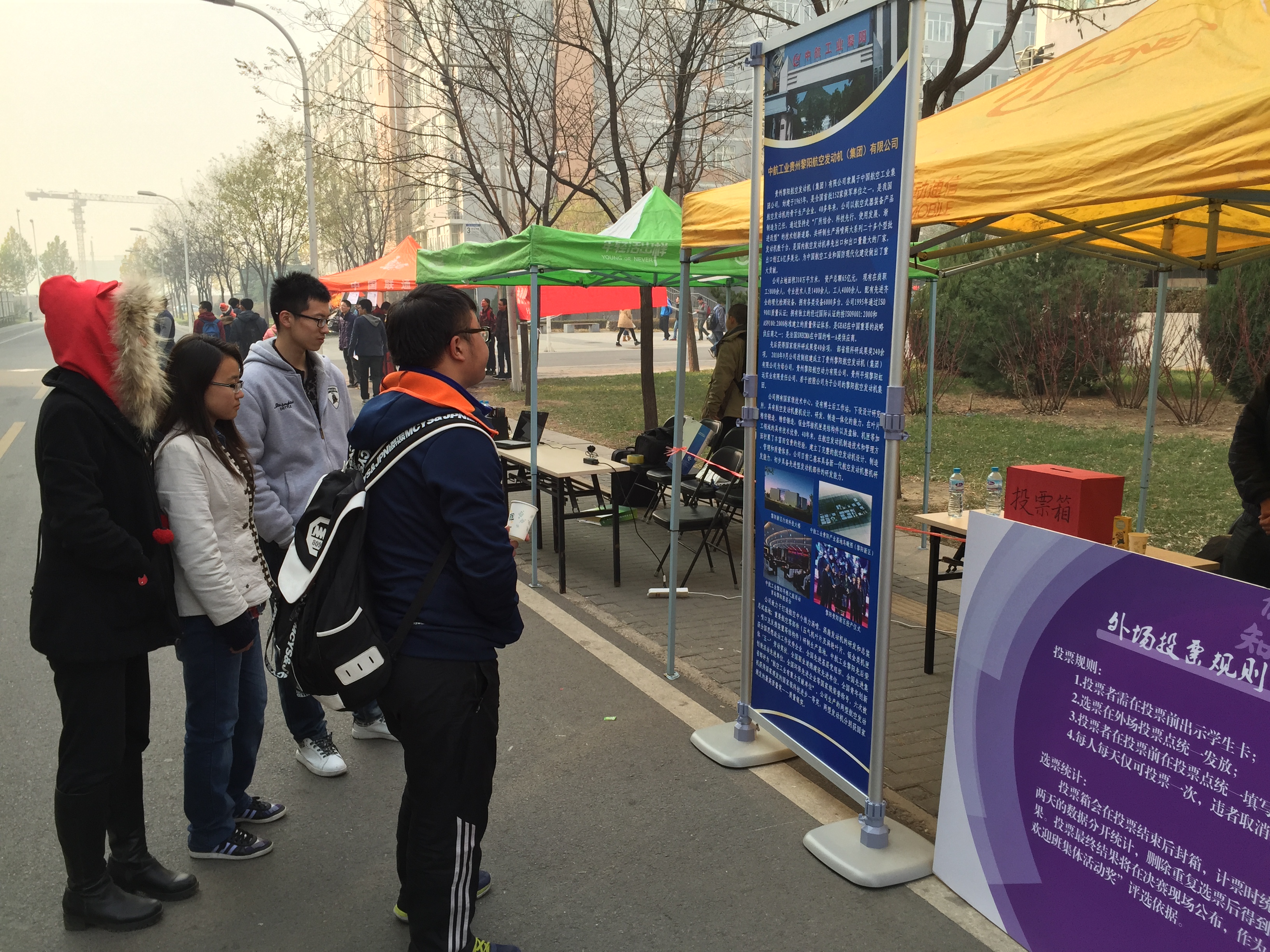 在本次比赛外场宣传活动中,每个班级都以蓬勃朝气彰显青春活力,用满腔热血弘扬“北航四爱”。在1、4号员工公寓之间的马路上,激情澎湃的口号声使得现场气氛热烈非凡。横幅与海报诉说着班级活动的点点滴滴,使同学们体会到了班集体活动的魅力。同学们纷纷驻足观看,置身于青春与激情的海洋。在活动内容上,有以心理健康为主题,主张缓解老员工心理压力的;也有以校园改进为主题,计划BICYCLE整理的等等。道路两侧的投票点,井然有序,为广老员工选择自己喜爱的班级活动提供了良好的平台。宣传活动期间我们用航拍记录全景,用照片铭刻瞬间,将一份份绚烂珍藏。