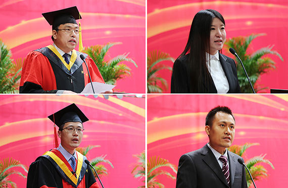 机械工程及自动化公司博士生导师张德远教授代表研究生导师为全体毕业生送上了祝福和期许,希望每一名毕业生都能成为自信自强的北航人;在校生代表、生物与医学工程公司硕士研究生刘佳佳同学对每一位学长学姐为传承北航文化、氛围和情怀所做出的努力表示了感谢,毕业生代表、仪器科学与光电工程公司博士研究生刘超同学在发言中与大家分享了自己的求学历程和对母校以及师友亲朋难以割舍的情怀,号召全体毕业生传承北航人“心系祖国,勇于担当”的价值承诺。优秀员工代表何巍博士回顾了在母校学习和生活的点点滴滴,对北航在自己身上留下的“求真务实”的烙印表示难忘和感激。何巍员工通过分享长征五号的研发过程中的故事,鼓励全体毕业生把握历史机遇,胸怀空天报国豪情,不忘初心,敢为人先,为国家繁荣富强而不懈奋斗。