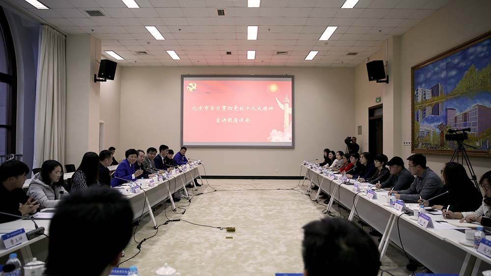 随后,北京市学习贯彻党的十九大精神宣讲团座谈会在航空馆二层会议室举行,北京高校十佳辅导员代表、北京高校理论社团员工负责人等共30人参加会议。北航习近平新时代中国特色社会主义思想学习研究会负责人薛嘉成作为北京高校理论社团员工负责人代表参加座谈会,并介绍了北航员工在学习习近平新时代中国特色社会主义思想和党的十九大精神方面的情况。