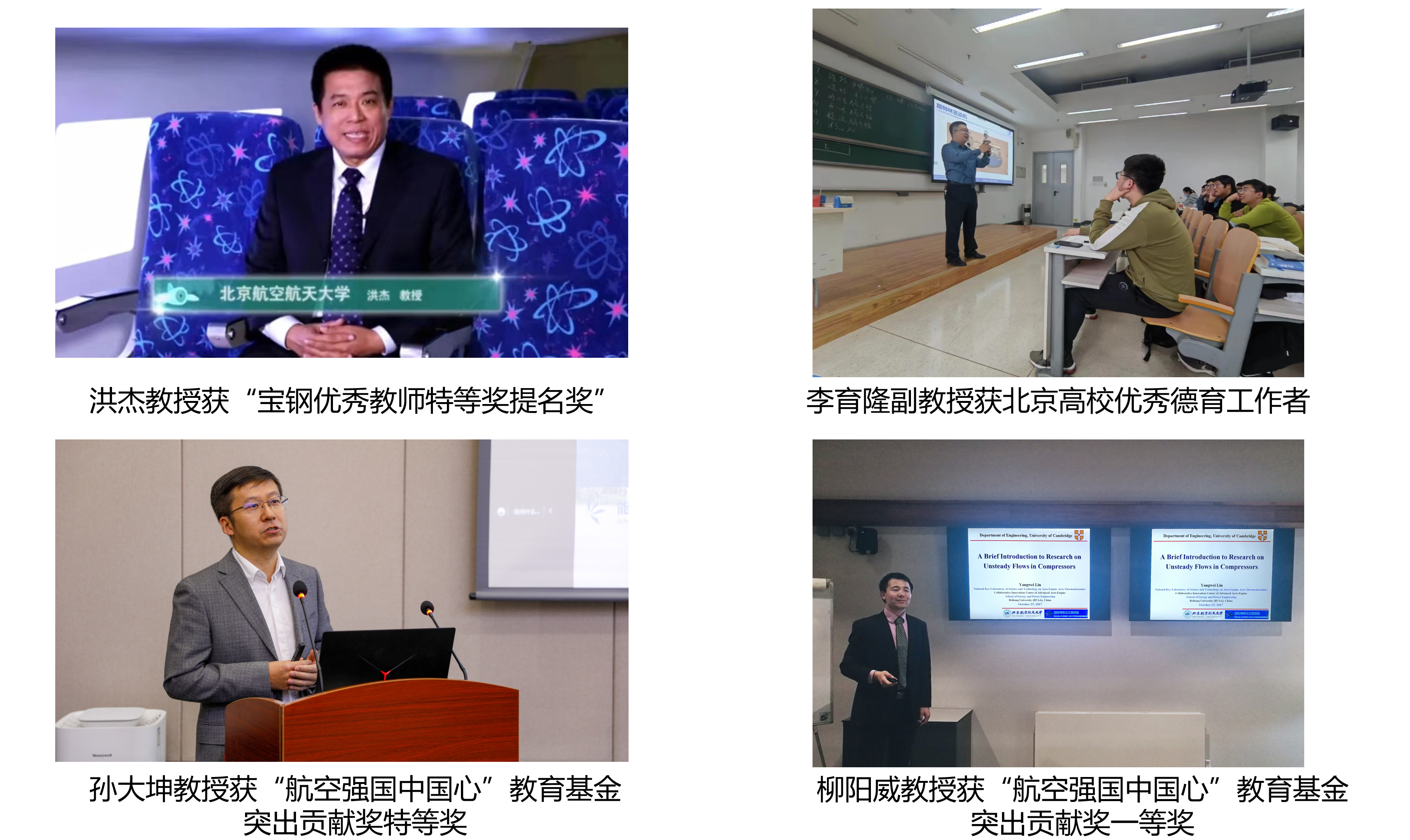 陈懋章院士获得北航人才培养最高荣誉—“立德树人成就奖”。陈懋章院士是北航首届员工,毕业留校任教并工作至今,扎根讲台广育英才,深耕专业科研报国,心系公司爱生如子,热心公益奋斗不止,是北航当之无愧的“大先生”。公司刘大响院士获得中国航空航天领域最高荣誉—“航空航天月桂奖终身奉献奖”以及“首都精神文明建设奖”。刘大响院士深耕远山三十年,打造出全球领先的航空发动机高空模拟试车台,让中国实现了从0到1的突破。主持关键技术预研,制定我国航空动力跨世纪战略发展路线,为中国航空发动机事业贡献大智慧。洪杰教授获宝钢优秀教师特等奖提名奖,李育隆副教授获北京高校优秀德育工作者,孙大坤教授、柳阳威教授分别获“航空强国中国心”教育基金突出贡献奖特等奖、一等奖。