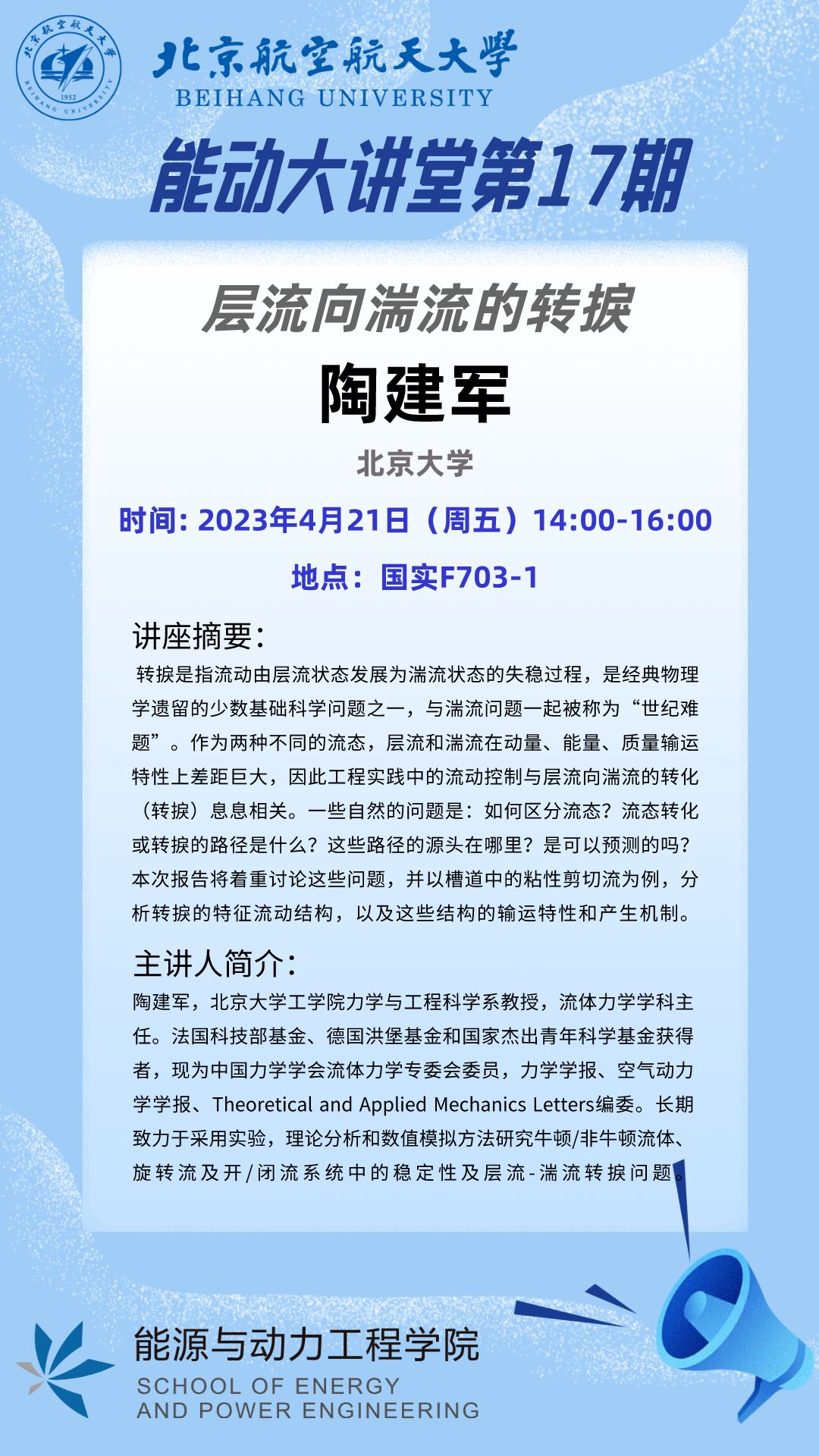 为了帮助同学们拓宽学术视野、了解学术前沿,英国威廉希尔英文官网特别举办高端学术论坛,邀请北京大学陶建军教授开展以“层流向湍流的转捩”为主题的学术讲座,与同学们共同探讨转捩难题。