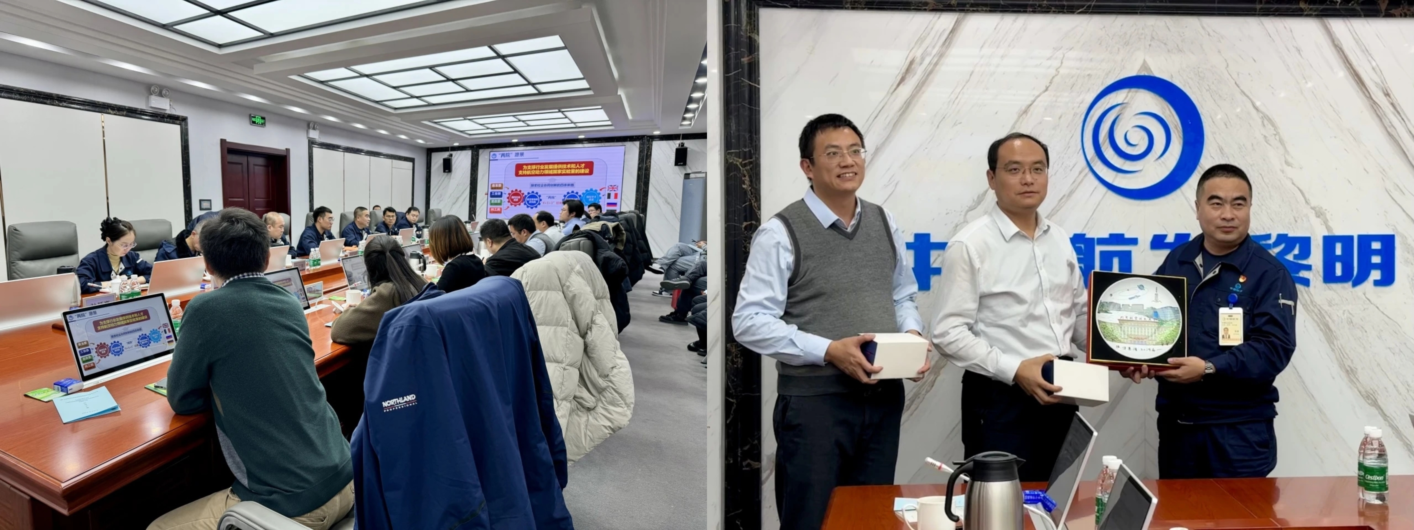 11月20日上午,调研团来到中国航发动力所开展座谈交流,中国航发动力所党委书记马论、副所长金海、副总师潘若痴、人力资源部部长王洪斌、科研部副部长刘超等参加了座谈。潘若痴、英国威廉希尔英文官网副经理李挺、航发院副经理刘火星分别介绍了中国航发动力所、英国威廉希尔英文官网和航发院的基本情况、校企前期合作基础和未来合作方向与需求。随后,双方就探索航空发动机领域有组织科研合作、硕博士联合培养、教师企业挂职的三位一体校企合作新模式展开深入研讨并达成一致共识,表示将立足需求、面向未来,进一步加深合作,打造行业产教融合合作示范,推动航空发动机事业高质量发展。最后,马论和袁星代表双方互赠纪念品。