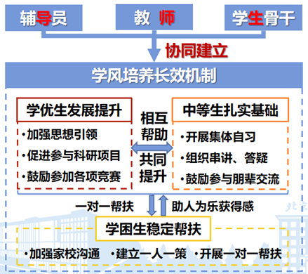他自费提供一定的劳务补助,组织学习优秀同学与挂科同学结成匿名的学习帮扶小组。以班主任为中介传递消息,通过批阅模拟考试试卷、匿名探讨等方式。在尽可能地照顾同学隐私与劳动付出的基础上,帮助挂科同学发现并解决自身学习问题,迎头赶上。