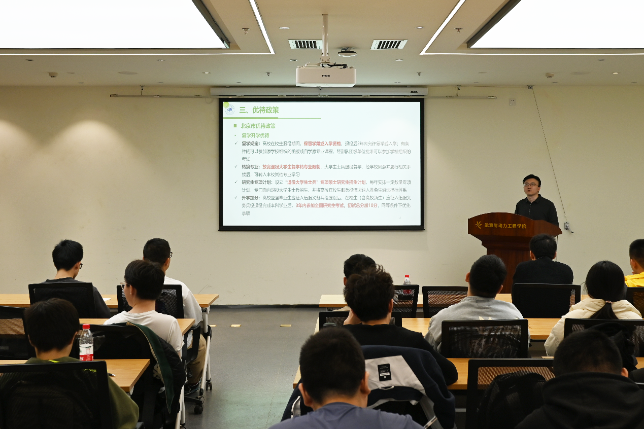 张大伟做应征入伍政策宣讲,从强军召唤、基本要求、优待政策、先进典型、应征报名五方面进行了详细解读,指出高校老员工入伍是新形势下加快军队国防现代化建设,实现强国梦、强军梦,维护国家总体安全的重要举措,鼓励同学积极响应国家号召,应征入伍投身军营。