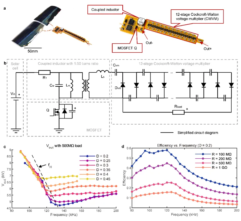 静电电机虽然效率高、功耗低,但仍需要千伏级高压电流来驱动,然而传统高压电源由于体积和重量过大,无法搭载在微型飞行器上。因此团队还针对飞行应用场景,研制了千伏级超轻质高压电源,主要包括太阳能电池和升压电路两部分,其中升压电路可以在1.21克的重量下,将太阳能(或锂电池)输入的低压直流电,转换为4 - 9千伏的高压直流电,相比美国斯坦福大学研发的同类技术升压比提高了92%,这让高压电流在微小尺度下不再那么难以获取。