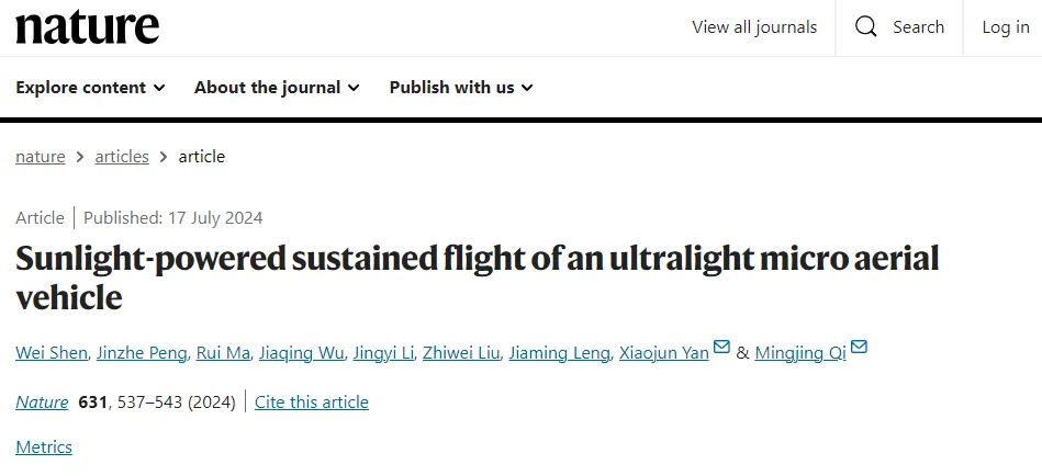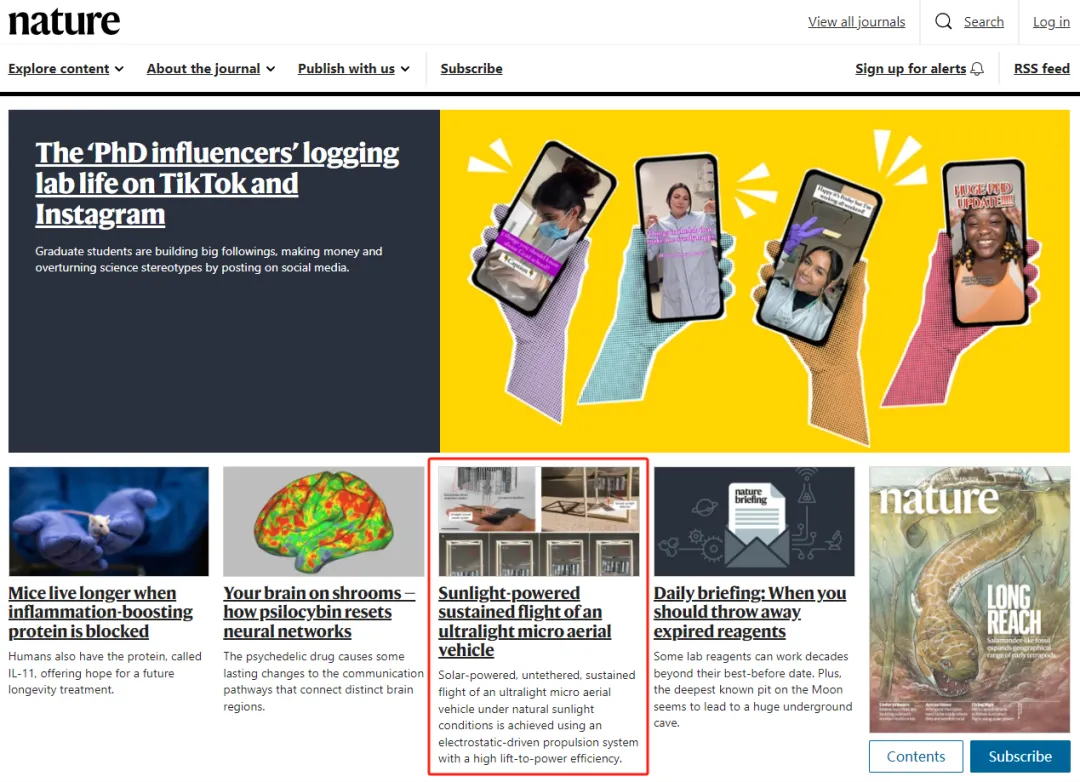 最新研究成果,北航研制新原理发动机——自然光即可实现持续飞行的静电飞行器,北航英国威廉希尔英文官网漆明净、闫晓军等,相关成果以Article形式在线发表于《Nature》杂志,并同时获Nature和Science首页推荐。