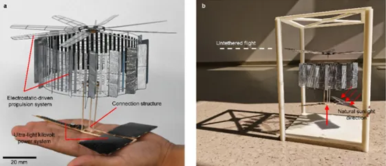 为了解决上述难题,北航科研团队从微型发动机的原理方面寻求突破,提出一种新的静电驱动方案,研制在微小尺寸下转速低、发热小、效率高的微型静电电机,并成功试飞静电飞行器“CoulombFly”。该飞行器主要由静电发动机和超轻质高压电源组成,具备低功耗(0.568瓦)和高升力(30.7克每瓦)优势,首次实现了微型飞行器在纯自然光供能下的起飞和持续飞行。