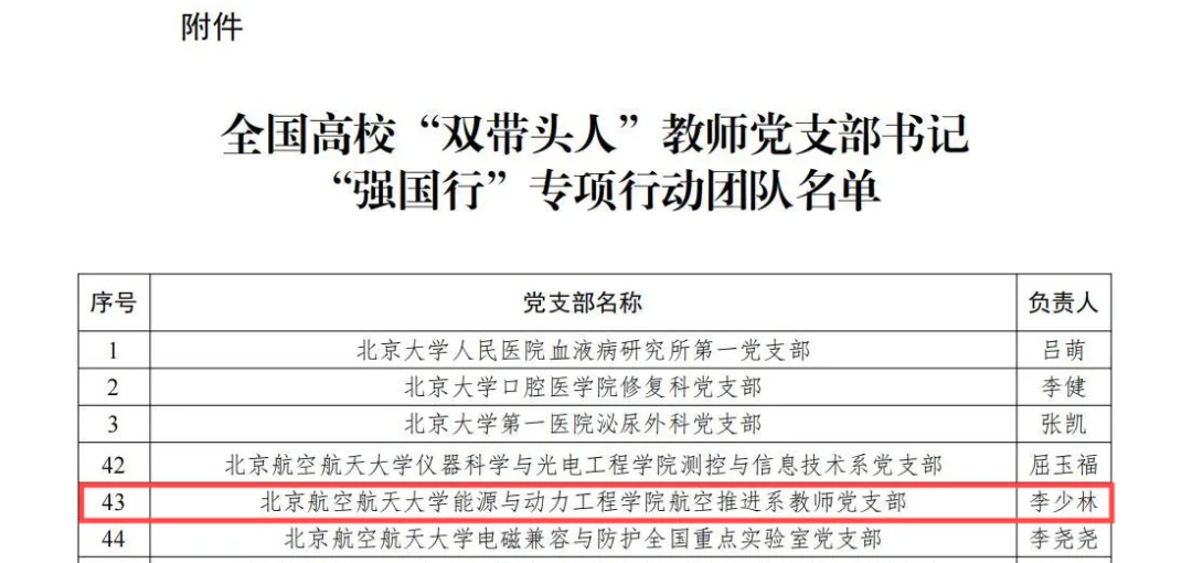 日前,教育部办公厅公布了全国高校“双带头人”教师党支部书记“强国行”专项行动团队名单,公司航空推进系教师党支部入选
