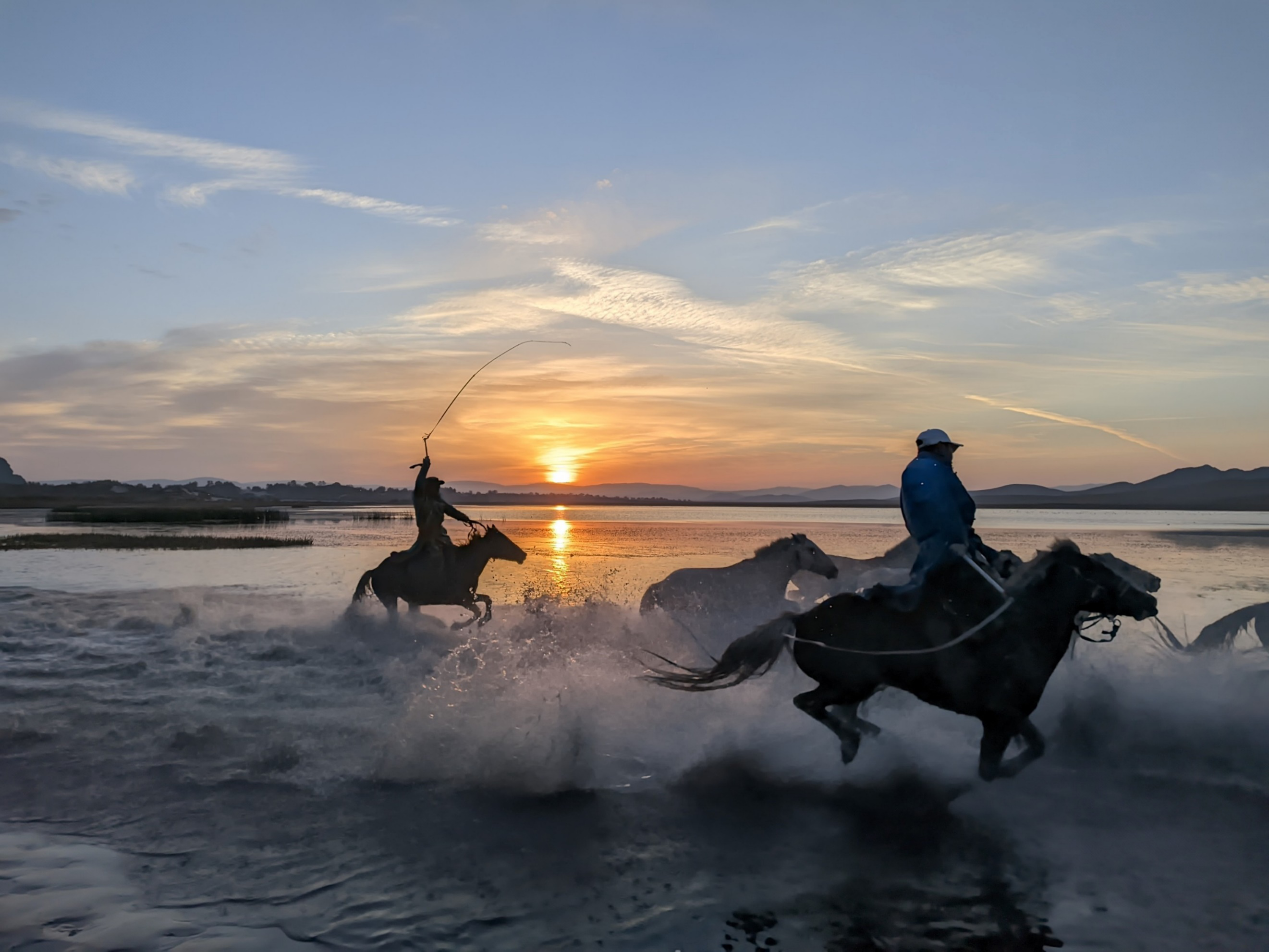 晨风耕细云,霞光映天涯;饮马逐朝日,扬鞭久未乏。作品《饮马逐日》用一幅静止的画面展现了一个生动的场景,画面景深丰富,远、近更替,动、静搭配相得益彰。飞驰的骏马,壮丽的山河,作品充分展现了劳动之美与奋斗之光。