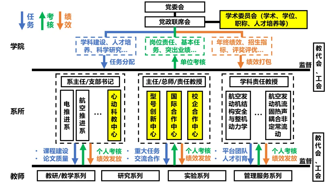 全面推进公司综合改革,突出党建重引领、学科重交叉、科教重融合、治理重协同,横向打通要素,纵向压实责任,建立“任务-考核-绩效”强关联机制和内涵导向的资源配置机制。以重点问题和短板弱项为突破口,开展体制机制改革;以学科平台团队一体化建设为中心,统筹资源配置;以关键办学指标为牵引,细化落实各级岗位职责;以完成度和贡献度为标准,实施考核及薪酬绩效管理。建强基层教学组织,成立型号创新中心、校企合作中心、国际合作中心,调整学术委员会组成。与7类团队共46位团队负责人签订目标任务书。下放考核自主权,激发各系及学科方向教学科研活力。关键指标完成率达到87.5%。