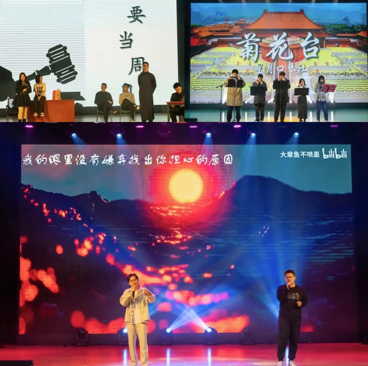 “DDL终结者”组合演出小品《我不要当周日》再次点燃全场欢乐的氛围,用喜剧的形式引发同学们关于时间分配的思考;星月口琴社带来了口琴演奏《菊花台》和《花之塔》,口琴清脆明亮,余音绕梁;王玺辰同学和辅导员倪书之演唱双人歌曲《别怕变老》,爱可以战胜一切,让所爱之人不再害怕变老。
