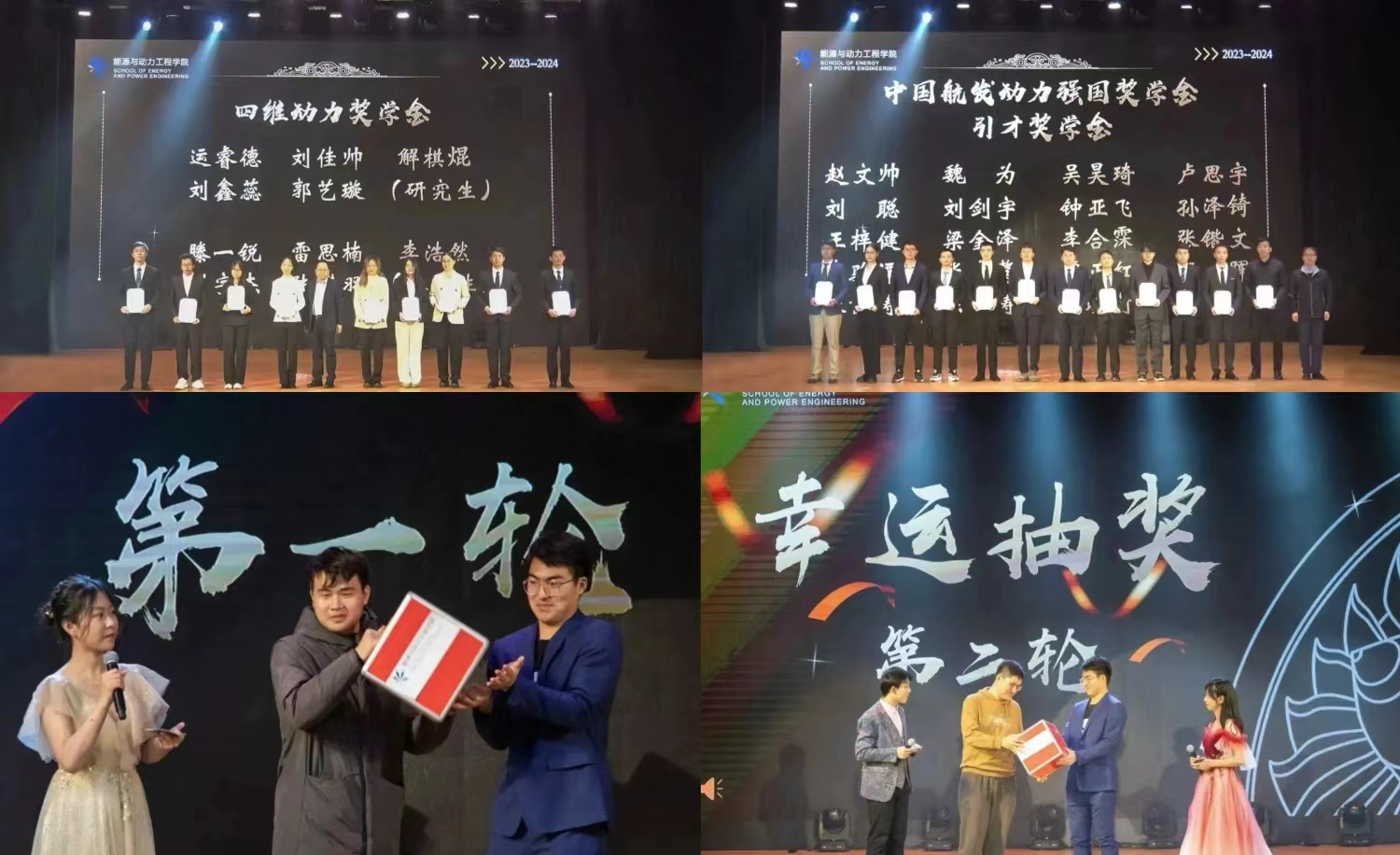 晚会期间进行了颁奖仪式。北京全四维动力科技有限公司常务副总经理李宝清为四维动力奖学金获奖同学颁奖。公司党委副书记谷萌为中国航发动力强国奖学金引才奖学金获奖同学颁奖。颁奖仪式后,同学们进行了“金鸡独立”、听歌识曲、抽奖等游戏互动环节。