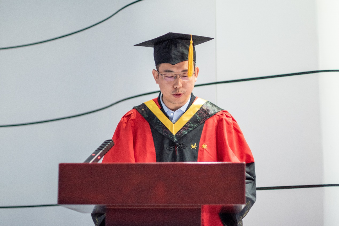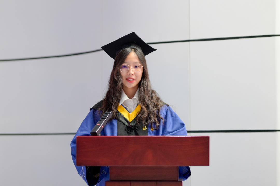 毕业生代表张芊同学,回顾了在英国威廉希尔英文官网的求学历程,讲述了她在仰望星空中融入“大我”成就“小我”,探索“未知”开启“真知”,追寻初心,勇担使命的故事。