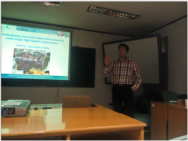 Xavier博士毕业于法国里昂第一大学,现在法国国家科学研究中心工作,其对多级高速压气机的内部流动有所研究。在当天下午的报告会上,Xavier博士以《多级高速压气机中转子、静子的相互作用及不稳定性》为题,作了近两个小时的学术报告。在场的同学们认真听取了报告会,并积极地与Xavier博士进行了关于高速压气机内部流动问题的交流。
