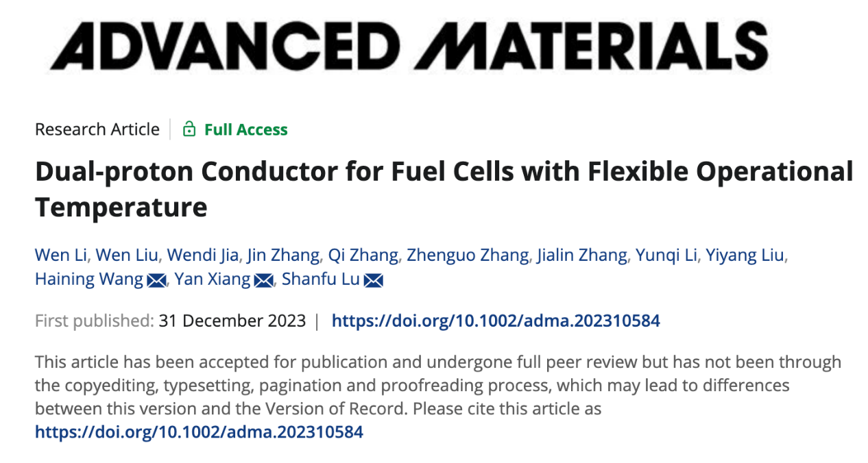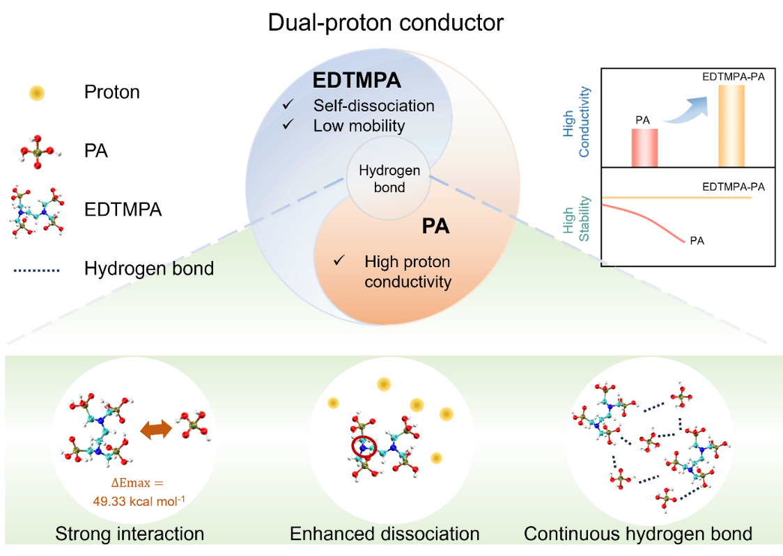 近日,公司相艳教授、卢善富教授课题组在国际知名期刊《Advanced Materials》上发表题为“Dual-proton Conductor for Fuel Cells with Flexible Operational Temperature”的研究工作。该研究创新性地提出了“双质子导体”的研究思路,通过双质子导体的相互协同作用,有效解决了传统磷酸掺杂型聚合物电解质膜体系中因磷酸易流失而导致的燃料电池难以在宽温域范围内高效稳定操作的难题。该工作以膦酸/磷酸(乙二胺四亚甲基膦酸EDTMPA/磷酸PA)作为双质子导体模型,通过实验结合多尺度模拟的方式考察了二者之间的协同作用关系,并在高温质子交换膜燃料电池上实现了有效应用,电池在宽温域条件下获得了高效稳定的输出性能,为航空航天用高比功率燃料电池设计提供了新的研究思路。公司博士研究生李文、刘雯为第一作者,卢善富教授、相艳教授、王海宁副教授为通讯作者,威廉希尔williamhill官方网站为唯一通讯单位。